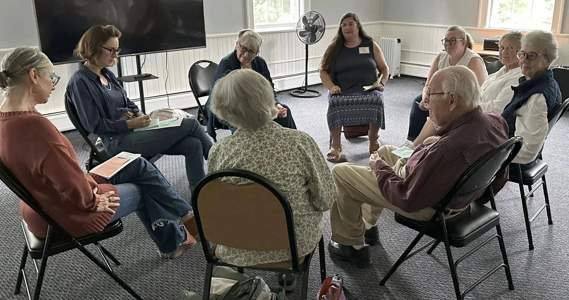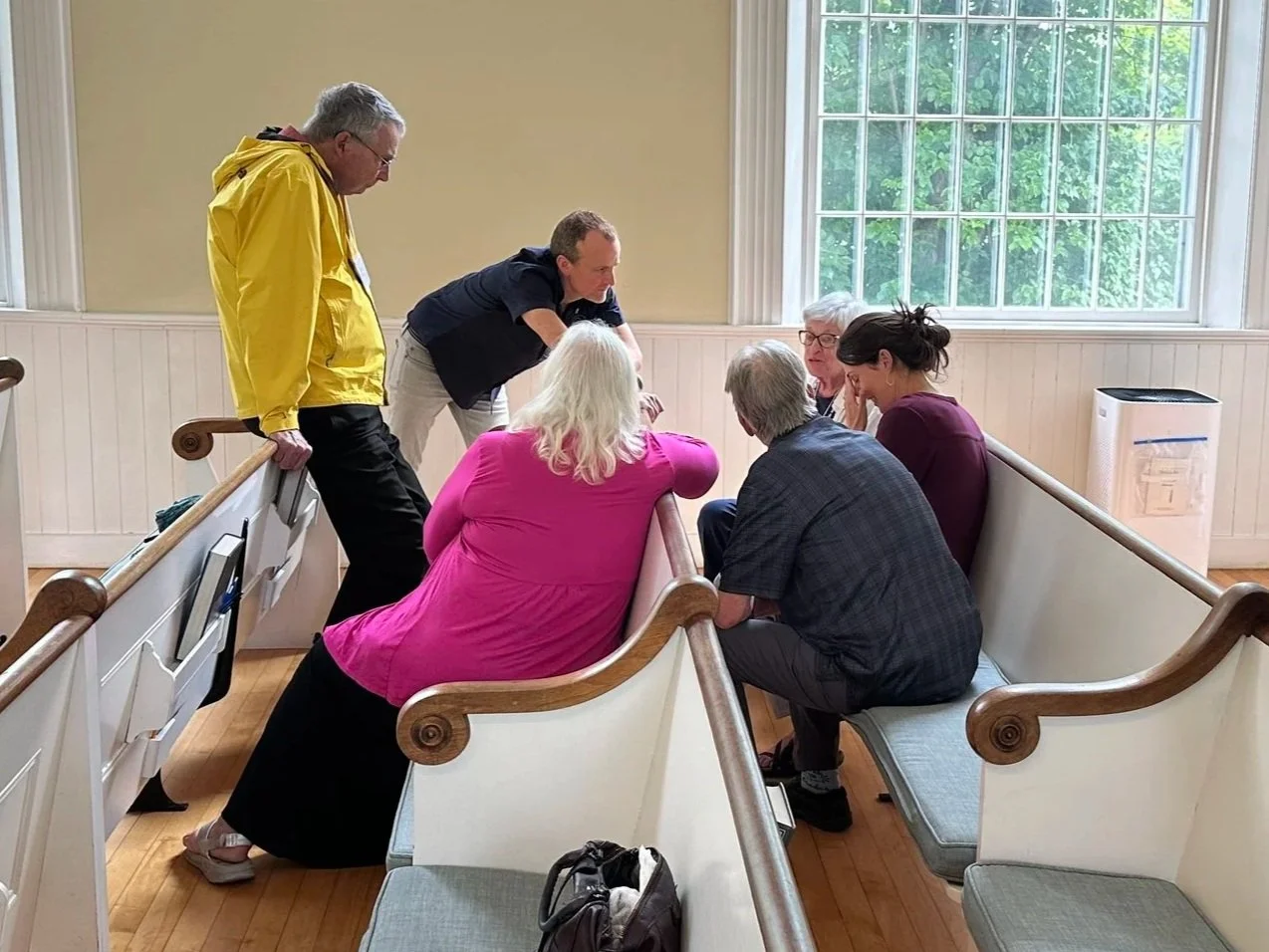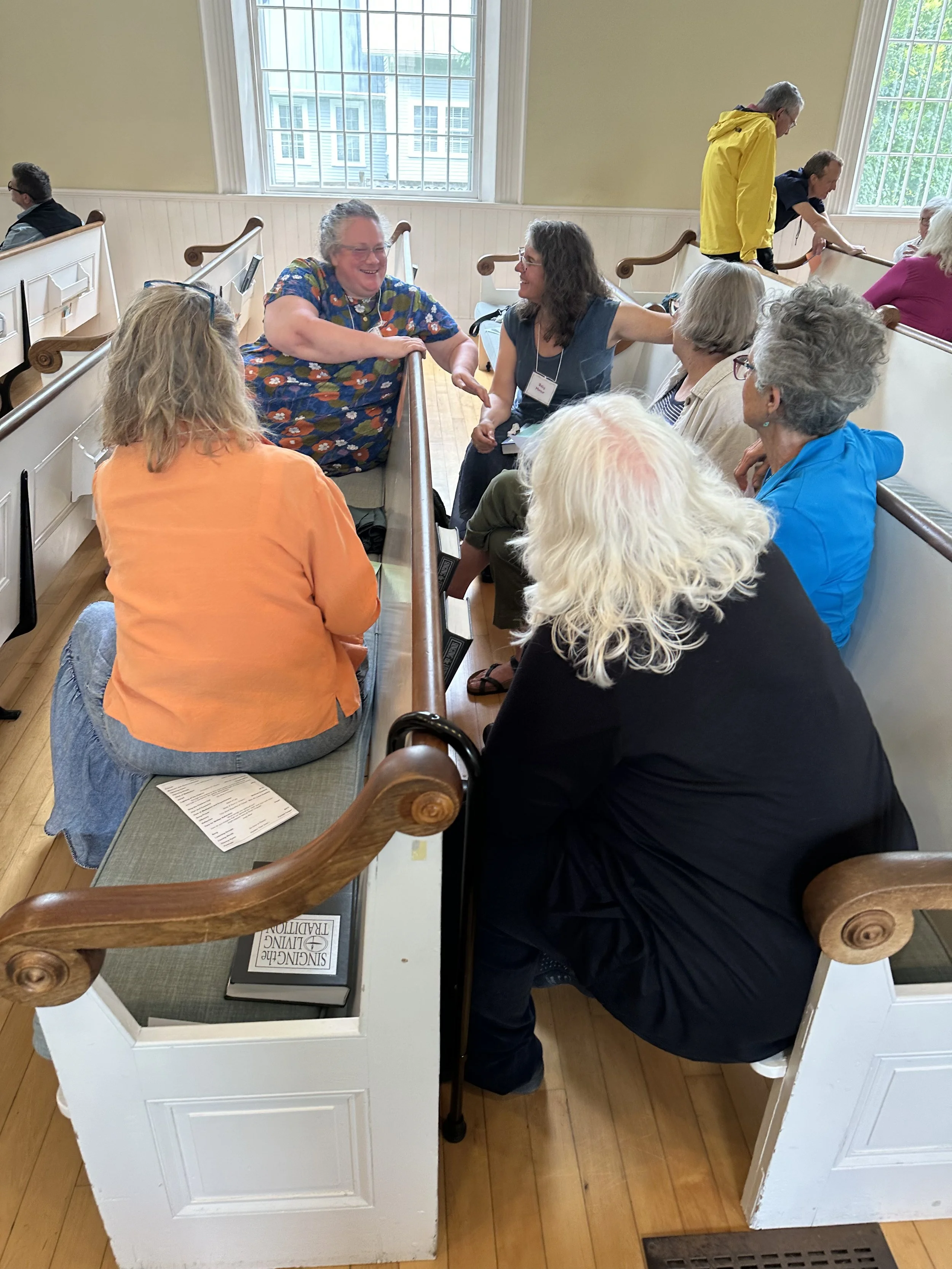 During the Sunday Service on July 27, 2025 the Board of Directors, with the assistance of Delia Clark, formed a circle in the sanctuary to organize into small groups to discuss the direction of the church. They were asked to write their answers to two questions: “What brings you spiritual joy?” and “How do you imagine that our spiritual joy - both your joys and mine - might happen here at North Chapel?” Their answers, on slips of paper, are now in a collage on the bulletin board in the social hall. Photos by Leon Dunkley