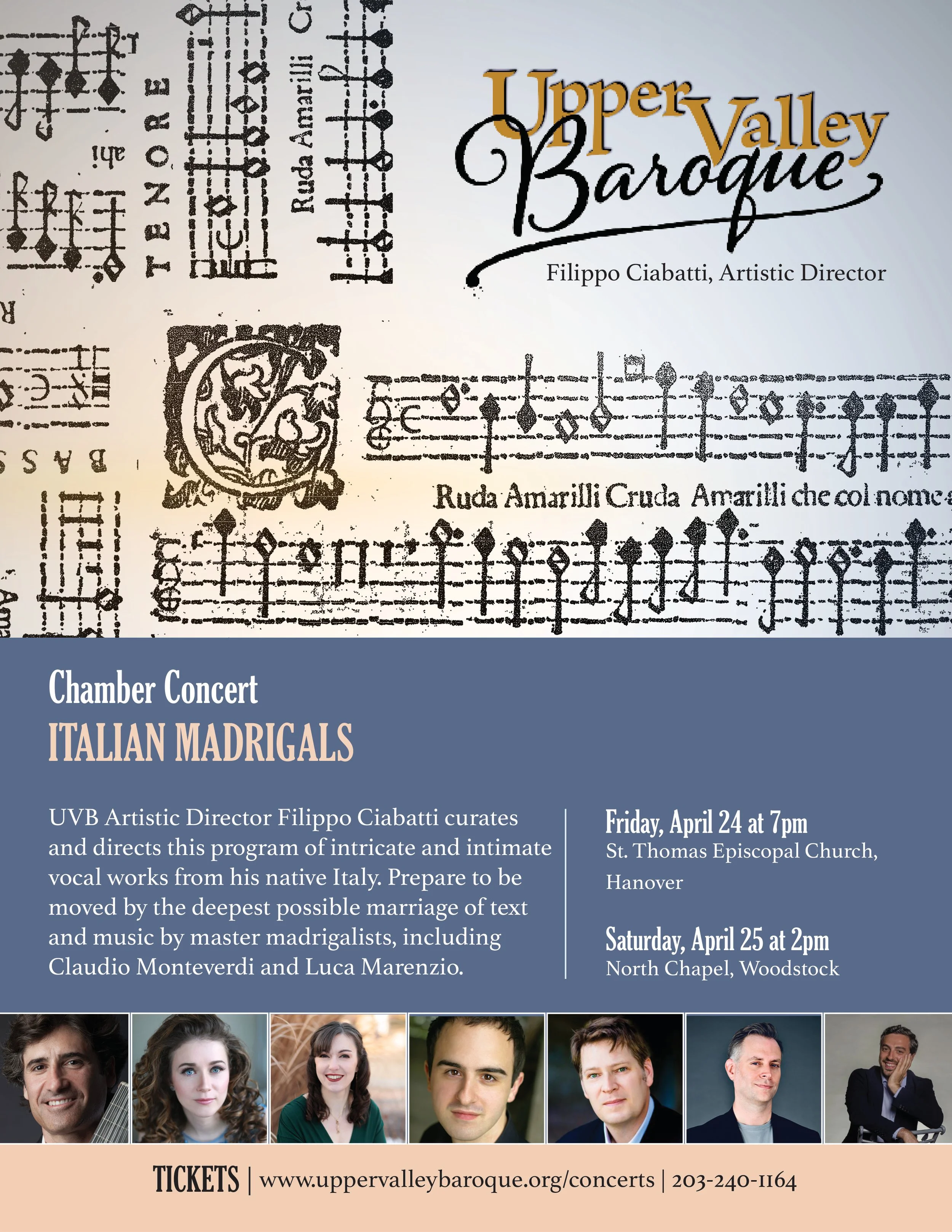 “Italian Madrigals” chamber concert will feature five outstanding Upper Valley Baroque singers, a lutenist on theorbo, and Artistic Director Filippo Ciabatti. The program includes intimate and moving works by Monteverdi, Marenzio, and Gesualdo, all masters of the madrigal form in their day.
